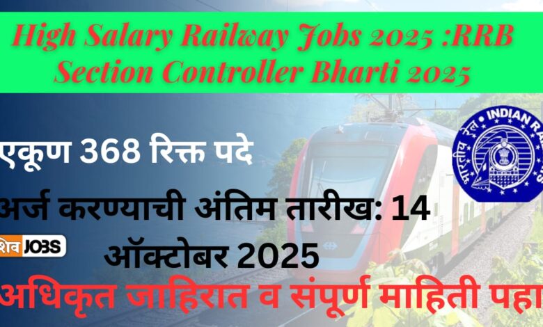 High Salary Railway Jobs 2025 भारतीय रेल्वे ही देशातील सर्वात मोठी सरकारी संस्था आहे. लाखो तरुणांचे स्वप्न असते की, त्यांनी रेल्वे मध्ये नोकरी मिळवावी. दरवर्षी Railway Recruitment Board (RRB) विविध पदांसाठी मोठ्या प्रमाणावर भरती प्रक्रिया राबवते. यावर्षी 2025 मध्ये देखील RRB Section Controller Bharti 2025 जाहीर झाली आहे. या भरती अंतर्गत 368 पदे रिक्त असून, पात्र उमेदवारांकडून ऑनलाइन अर्ज मागविण्यात आले आहेत. अर्ज प्रक्रिया 15 सप्टेंबर 2025 पासून सुरू होणार आहे आणि अर्ज करण्याची शेवटची तारीख 14 ऑक्टोबर 2025 आहे.RRB Section Controller Salary 2025 ही तरुणांसाठी आकर्षक आहे कारण हे पद High Salary Railway Jobs श्रेणीत मोडते. या नोकरीमुळे फक्त Secure Railway Job Career मिळत नाही तर Government Jobs with Pension Benefits देखील मिळतात.”