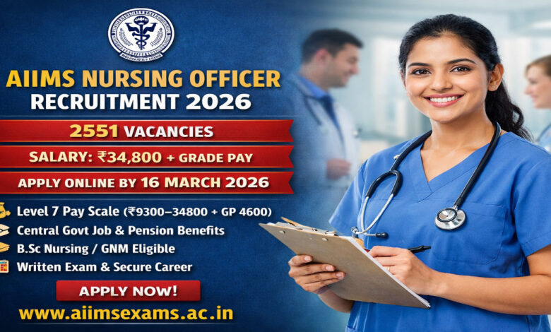 AIIMS Nursing Officer Recruitment 2026 – 2551 Vacancies | Level 7 Salary ₹34,800 + Govt Benefits | Apply Online Before 16 March