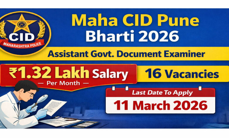 CID Pune Government Job 2026 ₹41,400–₹1,32,300 salary. Apply online for Assistant Government Document Examiner posts before 11 March 2026. Maha CID Pune Bharti 2026: Assistant Government Document Examiner Recruitment Begins Salary up to ₹1.32 Lakh per month | Government Authority Job | Long-term Stability The Criminal Investigation Department (CID), Pune, under the Government of Maharashtra, has officially released a new recruitment notification for Maha CID Pune Bharti 2026. This is a highly respected government job offering an excellent pay scale of ₹41,400 – ₹1,32,300, strong job security, and a chance to work in the core forensic and investigation ecosystem of the state.