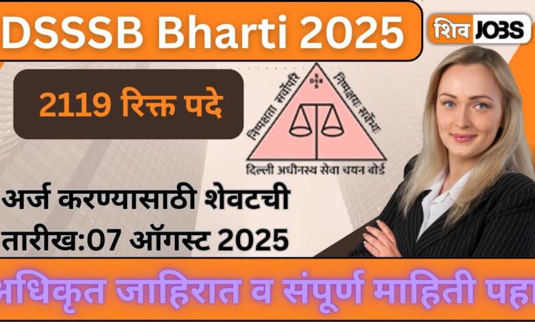 DSSSB Bharti 2025 दिल्ली अधीनस्थ सेवा निवड मंडळाने (DSSSB) विविध पदांसाठी एकूण 2119 भरती जाहीर केल्या आहेत. यामध्ये मलेरिया निरीक्षक, आयुर्वेदिक फार्मासिस्ट, PGT शिक्षक, घरगुती विज्ञान शिक्षक, सहाय्यक, तंत्रज्ञ, फार्मासिस्ट, वॉर्डर (फक्त पुरुष), प्रयोगशाळा तंत्रज्ञ, वरिष्ठ वैज्ञानिक सहाय्यक यांचा समावेश असून, अर्ज केवळ ऑनलाइन पद्धतीने स्वीकारला जाईल.