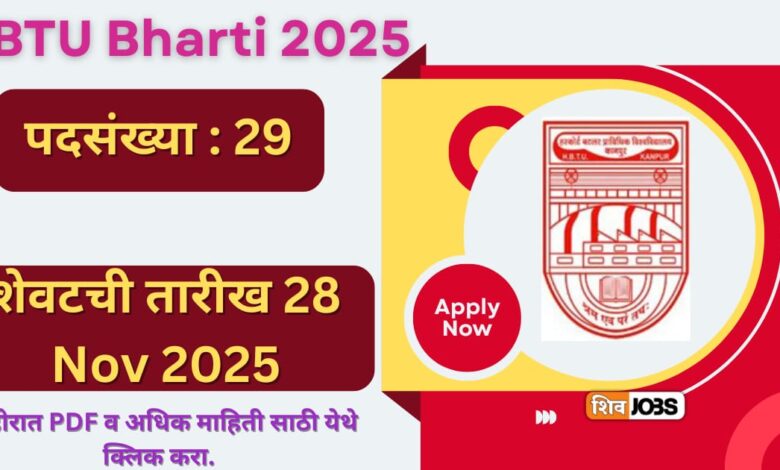 HBTU Bharti 2025 ही शैक्षणिक क्षेत्रात करिअर करायची सुवर्णसंधी आहे — जर तुम्ही पात्र असाल तर PDF वाचून, सर्व दस्तऐवज तयार करून आजच अर्ज करावा. लक्षात ठेवा: अंतिम तारीख 28 नोव्हेंबर 2025.
