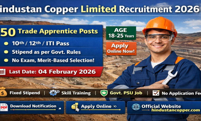 HCL Bharti 2026 notification out for 47 Trade Apprentice posts. 10th/12th/ITI pass can apply online. Govt PSU job, stipend, no exam. Last date 04 Feb 2026. If you are looking for a secure Central Government job with monthly stipend, long-term career stability, and skill-based training, then this update is for you. Hindustan Copper Limited (HCL), a prestigious Government of India enterprise, has officially announced Trade Apprentice Recruitment 2026. Selected candidates will receive a fixed stipend as per Apprenticeship Act norms, along with hands-on industrial experience in one of India’s most reputed PSU organizations.