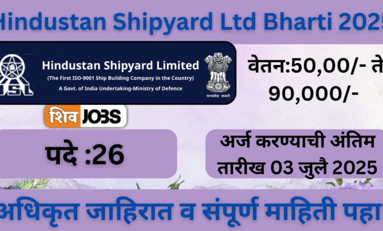 Hindustan Shipyard Ltd Bharti 2025 हिंदुस्थान शिपयार्ड लिमिटेड अंतर्गत ही भरती उच्च दर्जाच्या आणि उत्तम वेतनश्रेणीच्या पदांसाठी आहे. पात्र आणि इच्छुक उमेदवारांनी संधीचं सोनं करावं. ऑनलाईन अर्जाची शेवटची तारीख 03 जुलै 2025 असल्यामुळे अर्ज वेळेत सादर करणे अत्यंत आवश्यक आहे.