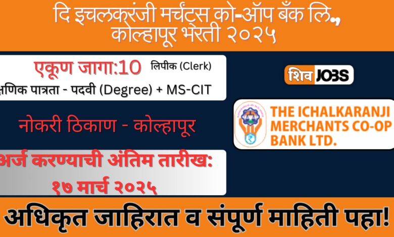 Marchants Co-Op Bank Ichalkaranji Bharti 2025 दि इचलकरंजी मर्चंट्स को-ऑपरेटिव्ह बँक लिमिटेड, कोल्हापूर अंतर्गत लिपीक (Clerk) पदासाठी भरती जाहीर झाली आहे. एकूण 10 रिक्त पदांसाठी ही भरती होणार आहे. इच्छुक आणि पात्र उमेदवारांनी ऑनलाइन अर्ज करावा. अर्ज करण्याची अंतिम तारीख 17 मार्च 2025 आहे. इच्छुक उमेदवारांनी संपूर्ण माहिती वाचून लवकरात लवकर अर्ज करावा.