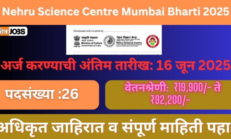 Nehru Science Centre Mumbai Bharti 2025 नेहरू विज्ञान केंद्र मुंबई येथे 2025 साली विविध पदांसाठी भरती जाहीर झाली असून, यामध्ये “तांत्रिक सहाय्यक ‘अ’, शिक्षण सहाय्यक ‘अ’, प्रदर्शन सहाय्यक ‘अ’, तंत्रज्ञ ‘अ’, ज्युनियर स्टेनोग्राफर, कार्यालय सहाय्यक (श्रेणी III)” या पदांचा समावेश आहे. एकूण 26 रिक्त पदांवर ही भरती होणार आहे. पात्र उमेदवारांनी 16 जून 2025 पर्यंत अर्ज करणे आवश्यक आहे. या भरतीबाबत संपूर्ण माहिती खाली दिली आहे.