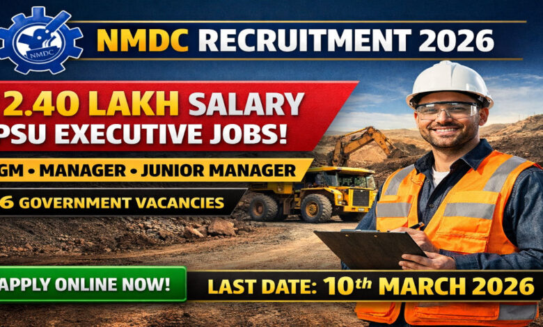 NMDC Recruitment 2026 offering ₹37,000 to ₹2,40,000 monthly salary. Central PSU Executive Jobs for AGM, Manager & Junior Manager. Limited 06 vacancies. Secure high-paying government mining career before 10 March 2026. Looking for a high-paying Central Government job with long-term stability? Here’s a golden opportunity. NMDC Recruitment 2026 offers salary packages starting from ₹37,000 and going up to ₹2,40,000 per month. Working under a reputed PSU ensures job security, structured promotions, and attractive allowances.