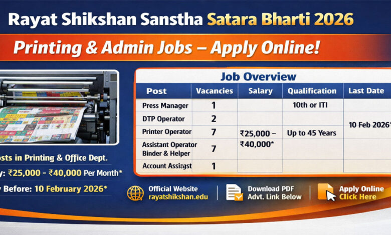 Rayat Shikshan Sanstha Satara Bharti 2026 is a practical opportunity for candidates with printing, DTP, machine handling, and account skills. Stable institution, structured work setup, and local job location make this recruitment attractive.