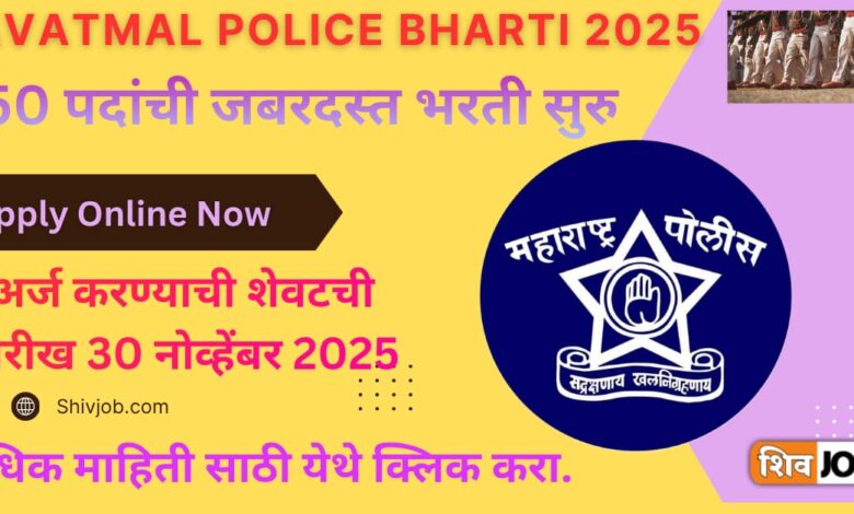 Yavatmal Police Bharti 2025 – 150 पदांची भरती | Apply Online Now | Power Guide Yavatmal Police Bharti 2025 Yavatmal Police Recruitment 2025: Big Update! Superintendent of Police, Yavatmal यांनी 150 पोलीस शिपाई पदांसाठी भरती जाहीर केली आहे. ऑनलाइन अर्ज 29 ऑक्टोबर 2025 पासून सुरु होणार असून अर्ज करण्याची शेवटची तारीख 30 नोव्हेंबर 2025 आहे.
